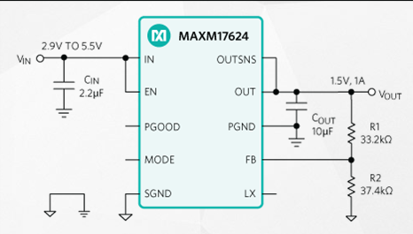 MAXM17623和MAXM17624模塊在穩態工作時采用峰值電流模式控制方法。為降低輸入浪涌電流,器件提供1ms固定軟啟動時間。兩款模塊均可選擇輕載時采用PWM或PFM模式。選擇PWM模式時,MAXM17623工作在固定2MHz開關頻率,MAXM17624工作在固定4MHz開關頻率。MAXM17623提供0.8V至1.5V輸出電壓,MAXM17624提供1.5V至3.3V輸出電壓。